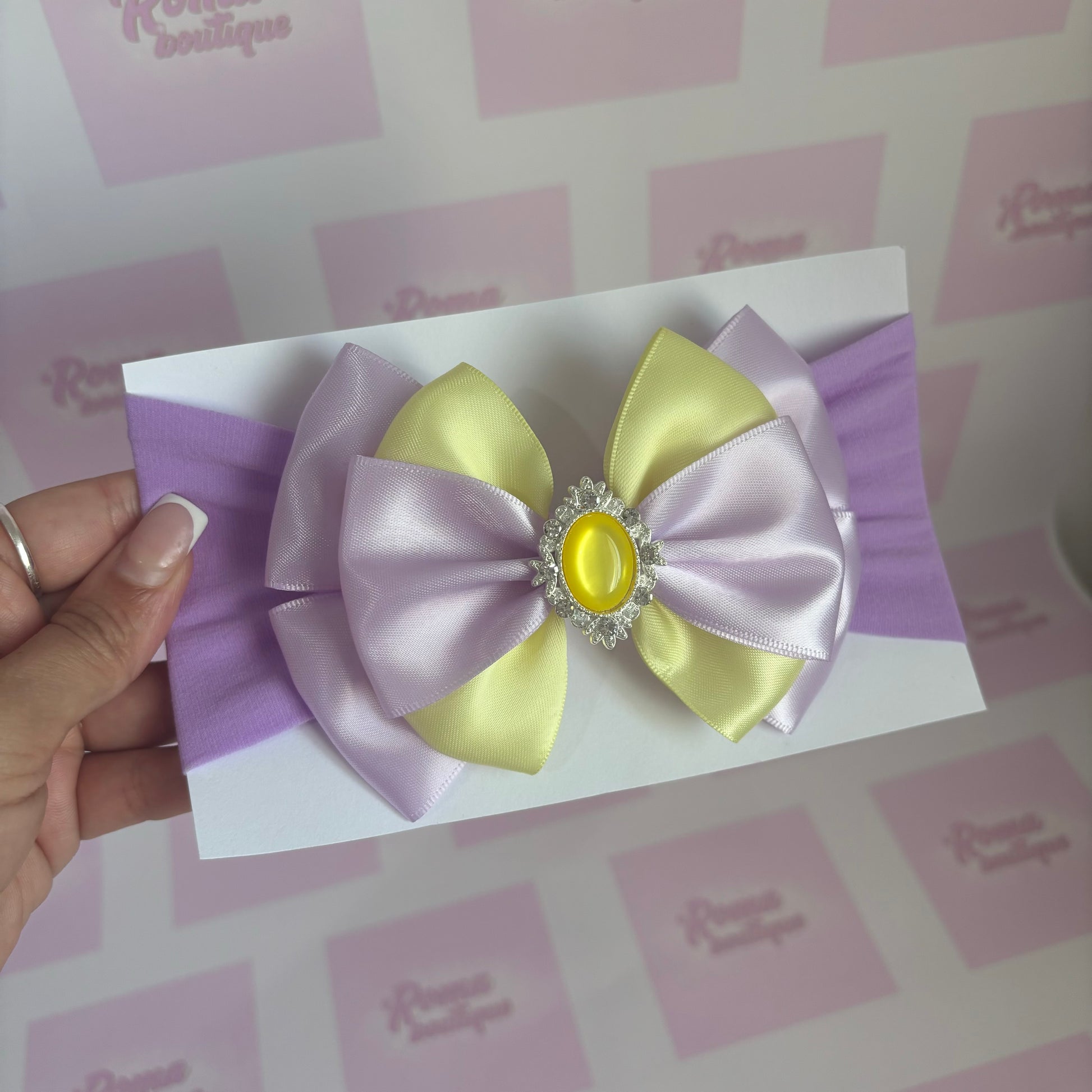 Triple layer bow with lilac and lemon, lemon silver gem centre